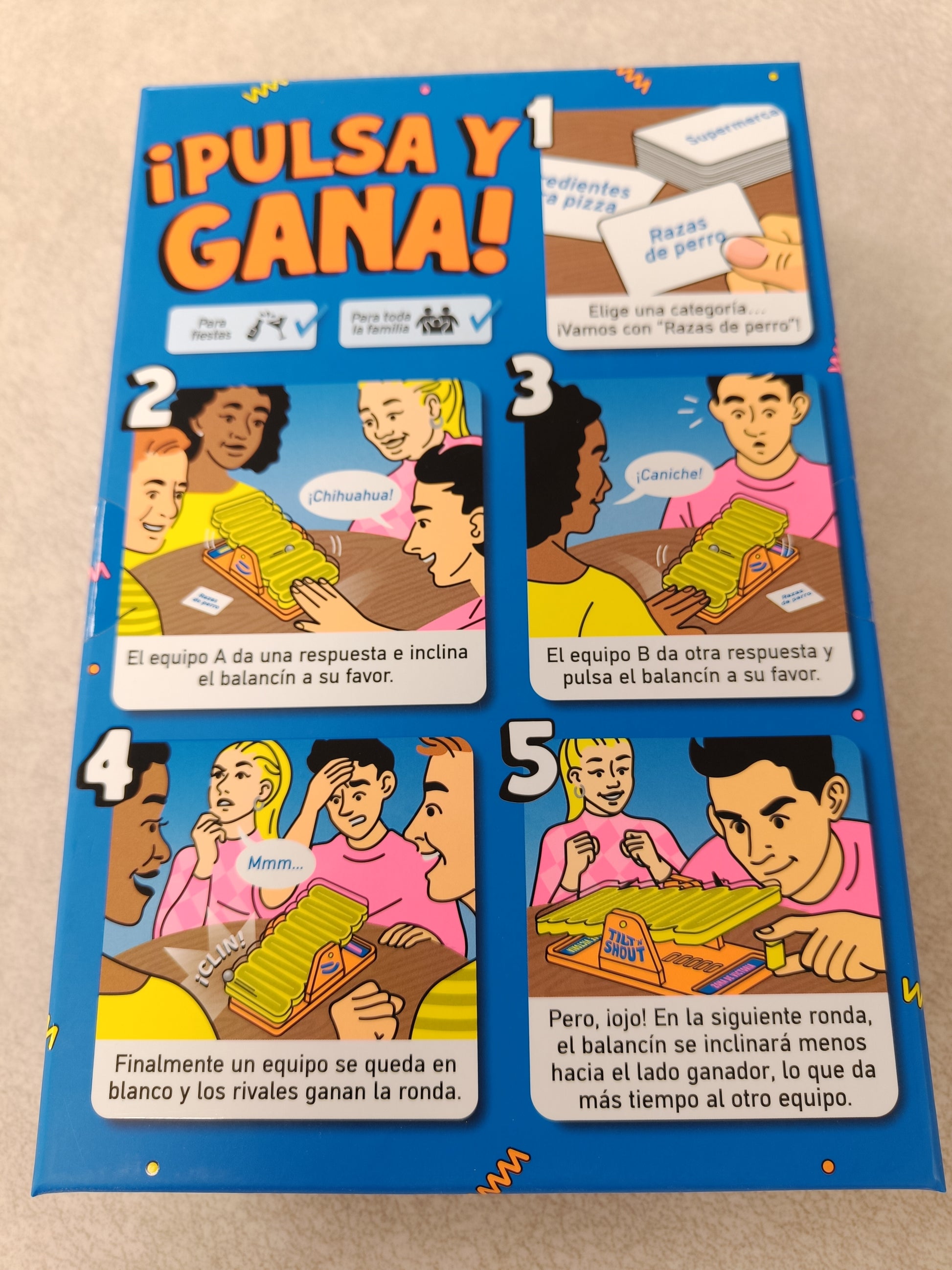 Ojo a la edad: La caja marca 10 años y estoy de acuerdo. No por la dificultad de las palabras, sino por la coordinación: pensar, hablar y pulsar el balancín a la vez requiere una madurez ejecutiva que un niño de 7 años aún está desarrollando.